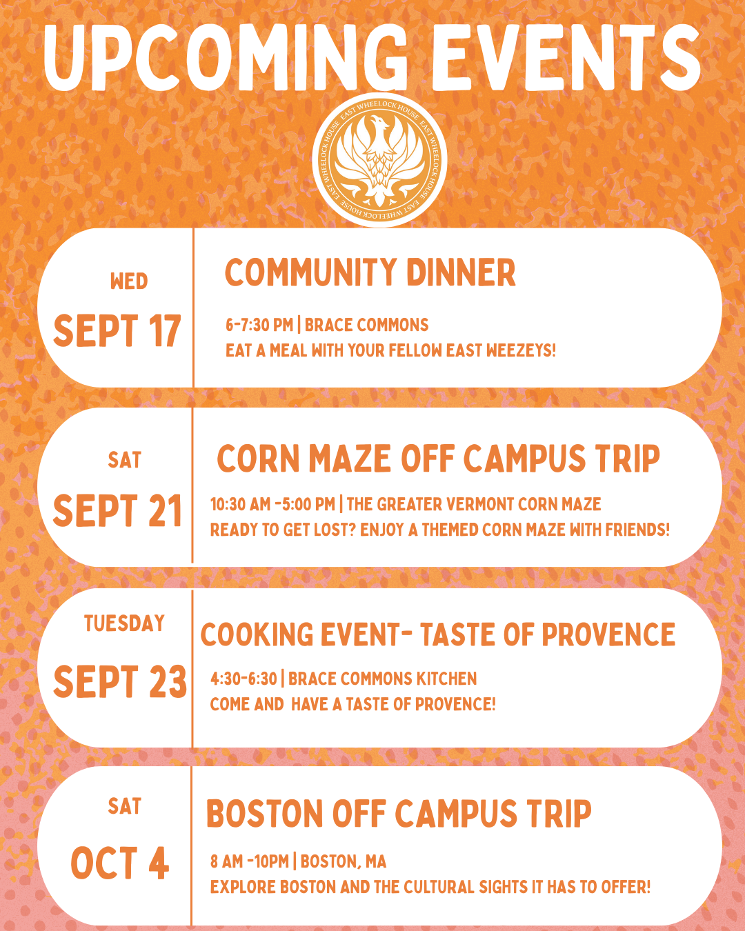 Welcome to the East Wheelock House website at Dartmouth College! This site is your go-to resource for everything happening in our house community. Here, you’ll find details on upcoming events, information about our supportive staff, and ways to connect with fellow residents.